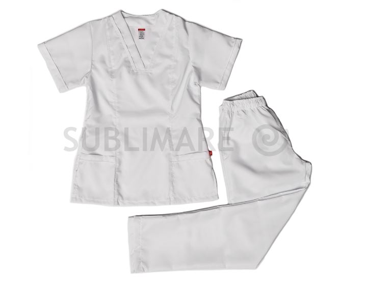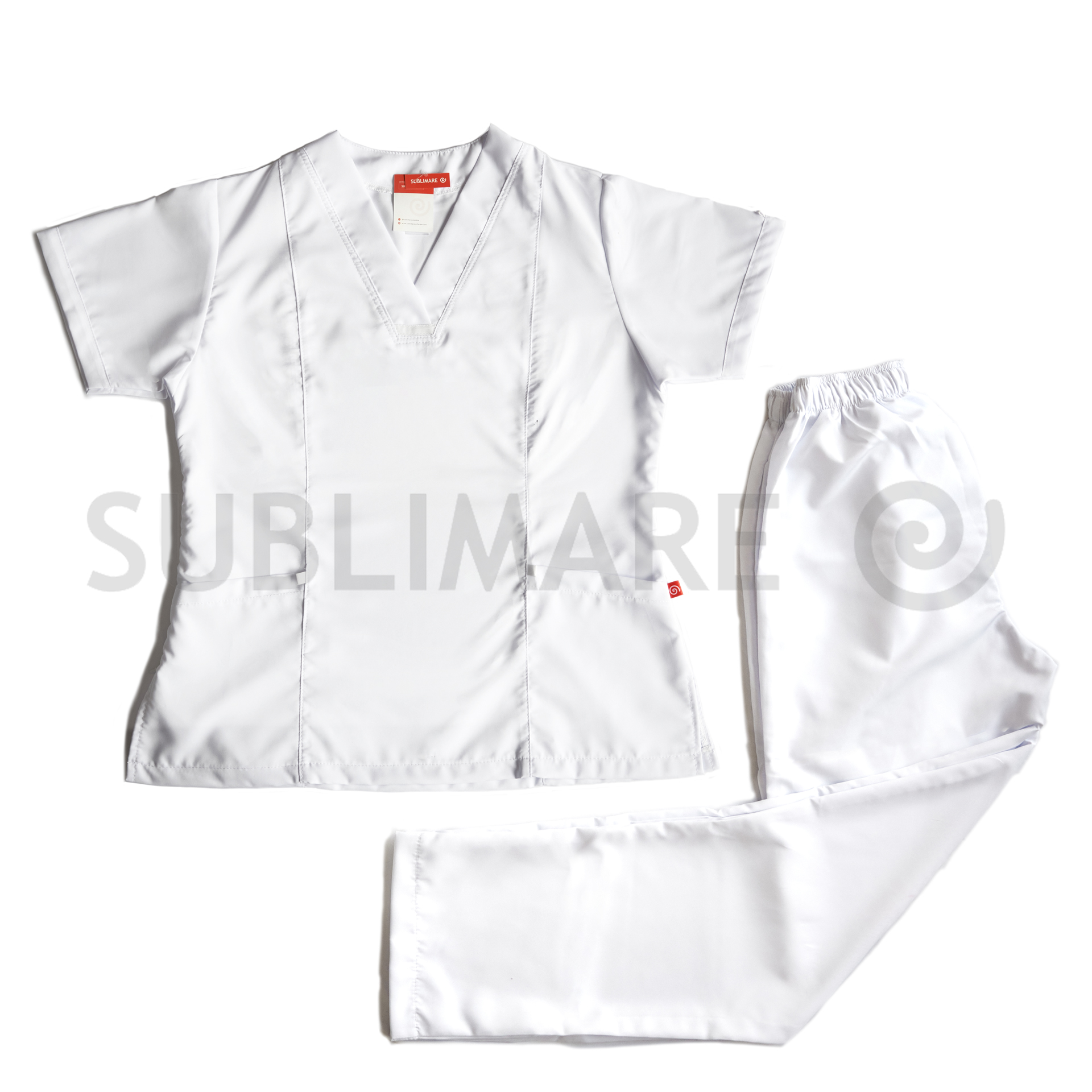 Uniforme en tela antifluido, incluye pantalón y blusa cuello alto, con cremallera lateral y bolsillos delanteros en color blanco