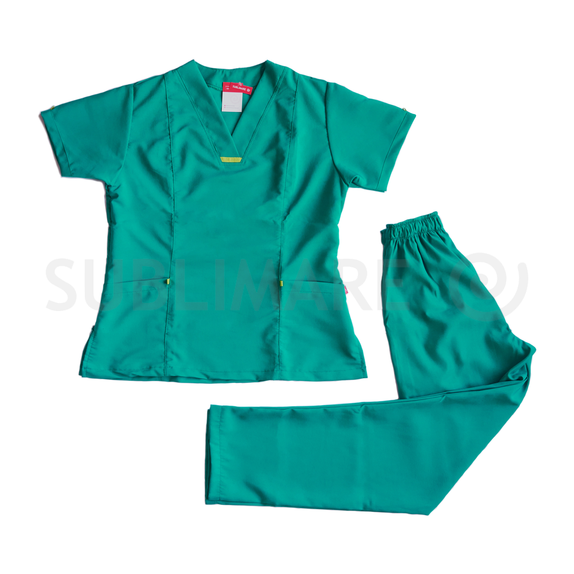 Uniforme en tela antifluido, incluye pantalón y blusa cuello alto, con cremallera lateral y bolsillos delanteros en color aguamarina